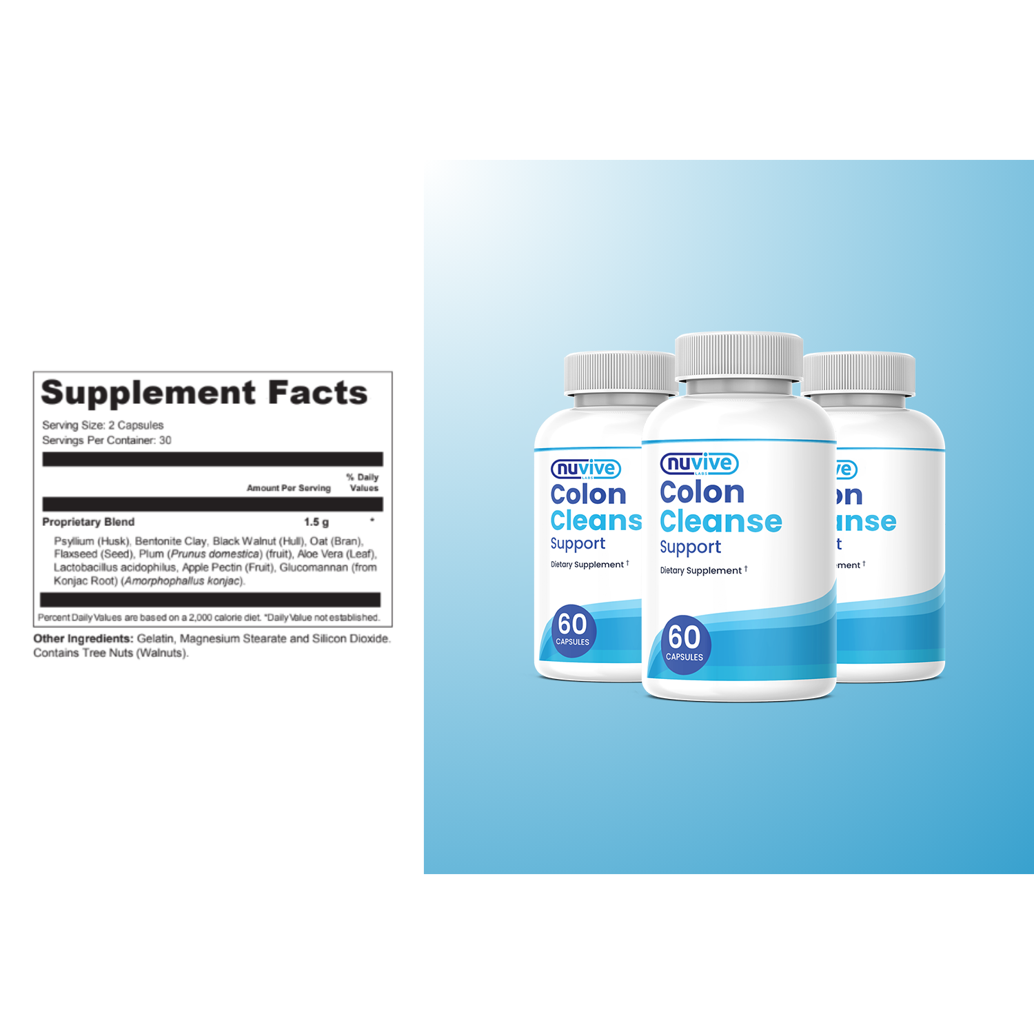 Nuvive Labs Colon Cleanse Support is a natural, proprietary formula, proudly made in the USA at an FDA-registered and GMP-certified facility. Produced using precision-engineered machinery under stringent, sterile conditions, this formula is crafted with quality in mind. Each ingredient is soy-free, dairy-free, non-GMO, and undergoes rigorous third-party testing to help ensure purity and potency. As a precaution, we recommend consulting your doctor before use.